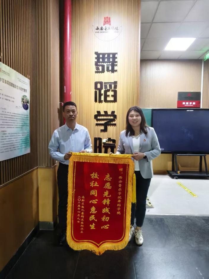 4月22日,高新区鱼翔社区党总支书记一行到访西安音乐学院舞蹈学院,向学院团总支赠送题为“志愿先锋践初心...