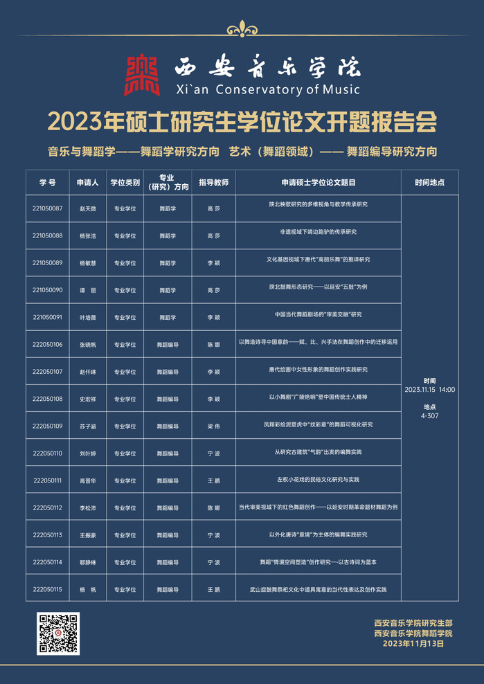 2023年11月15日,西安音乐学院舞蹈学院2022级舞蹈专业硕士研究生于4-307举行开题报告答辩会。本次答辩会邀...