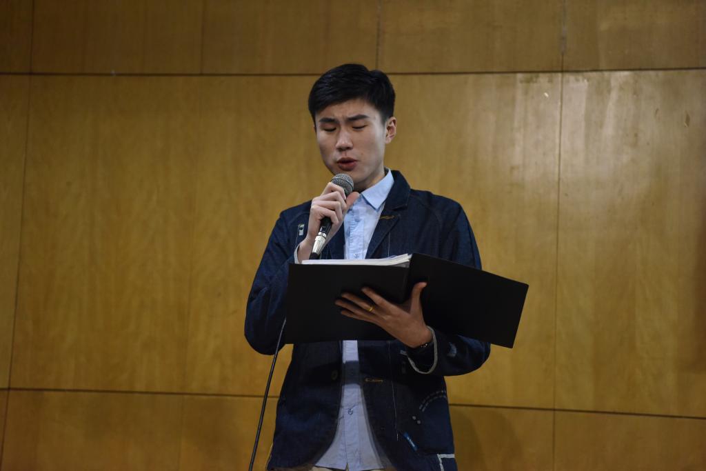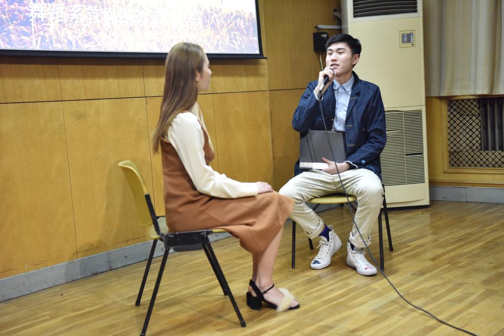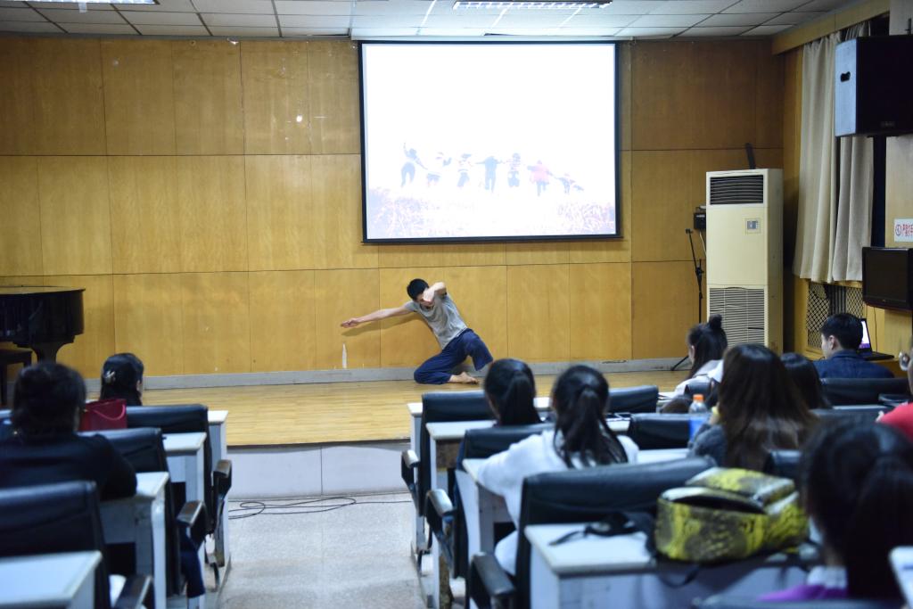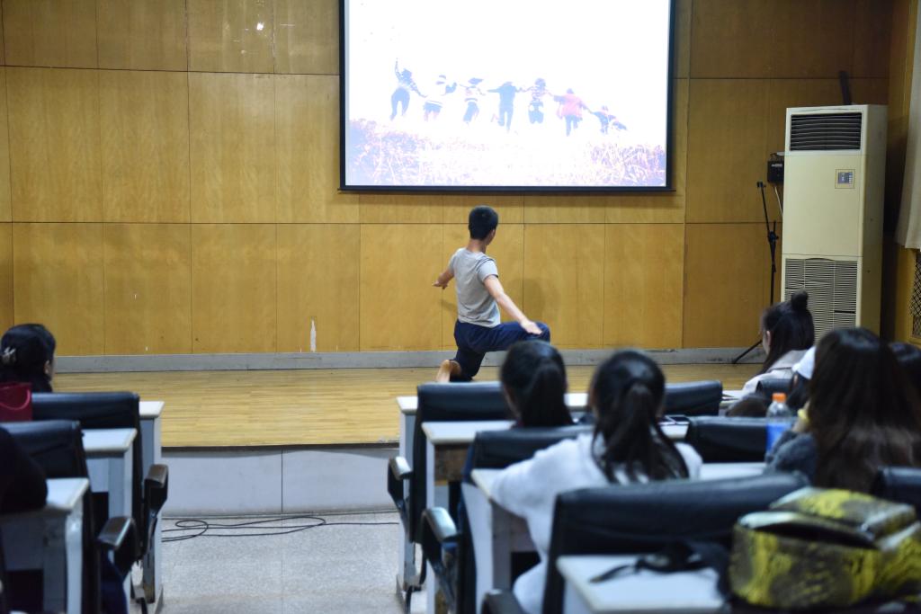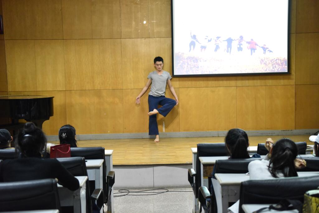 最后,16级编导班史皓南同学为大家带来一段特殊的读书感悟。因为读杨照先生的《呼吸》而创作了同名舞蹈。他用流畅、生动的肢体语言为我们完美的诠释了音乐在呼吸里,在身体里。身体的每一个部位都可以成为音乐中不同的音符。