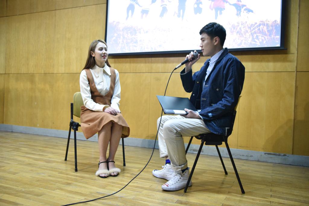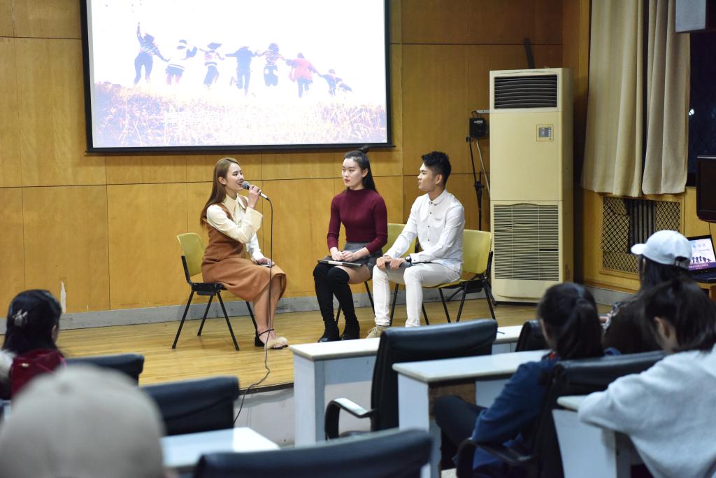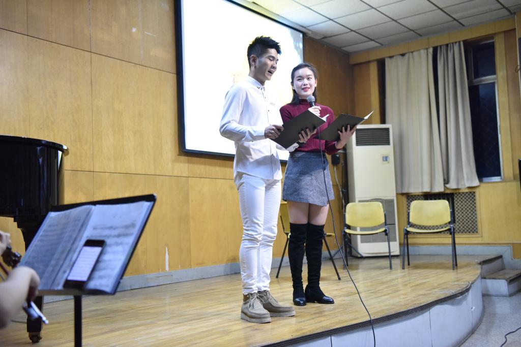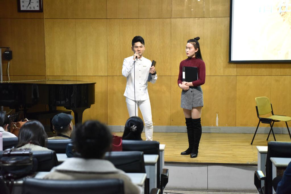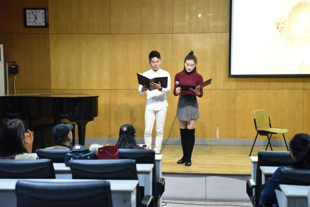2014级学生孙延文和范梦瑶在即将面临毕业之际,分享了她们大学四年来发生的趣事和对学弟学妹们的寄语。孙延文同学第一次敞开心扉向大家分享了他青春里的小秘密,让人潸然泪下。最后两人用低沉浑厚、温和动人的声音朗读了题为《活在阳光下》的散文,带来了希望每个人能突破成长,越过困难,最终活在阳光下的美好祝愿。