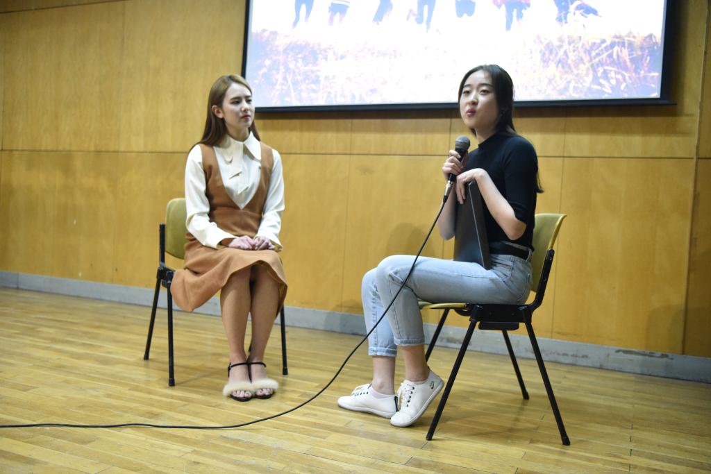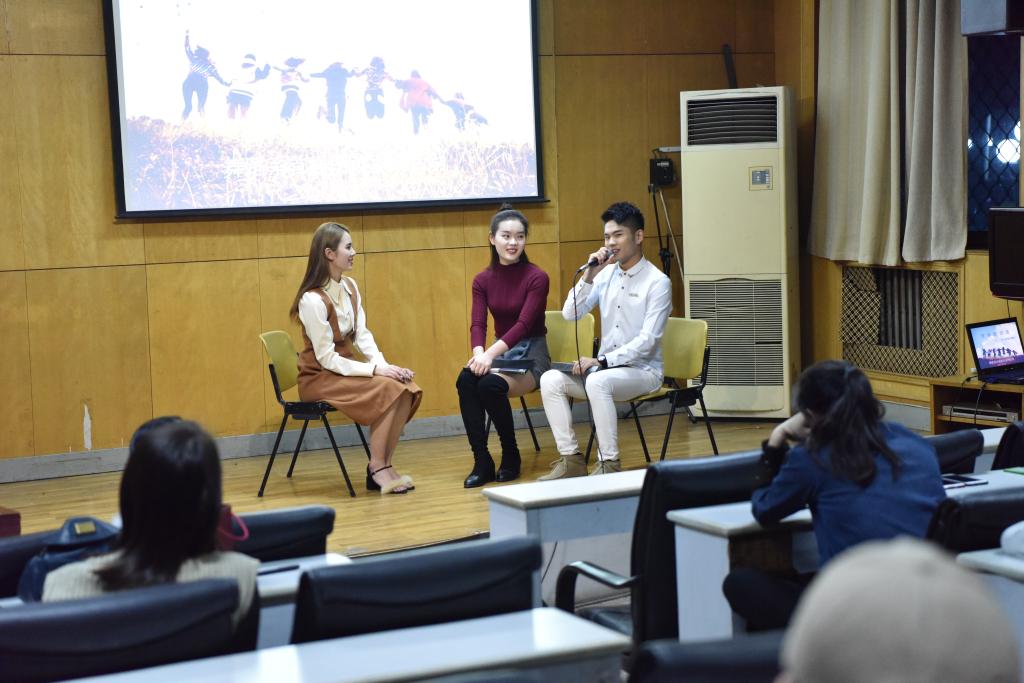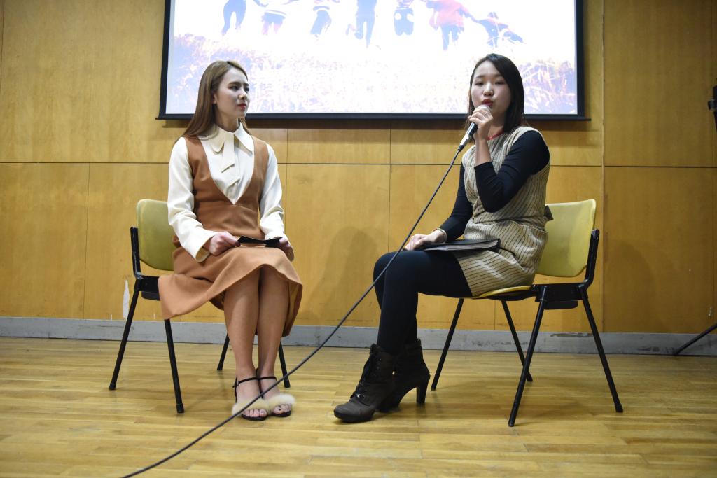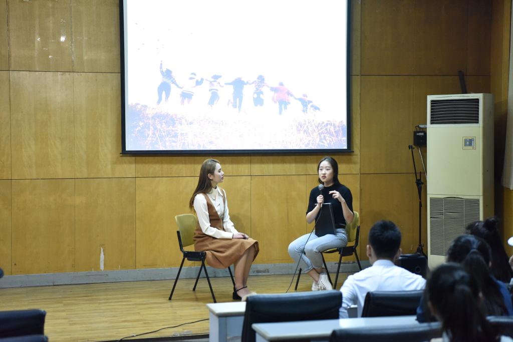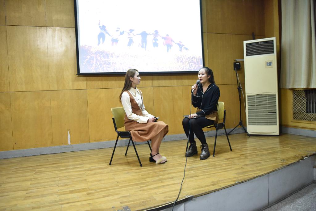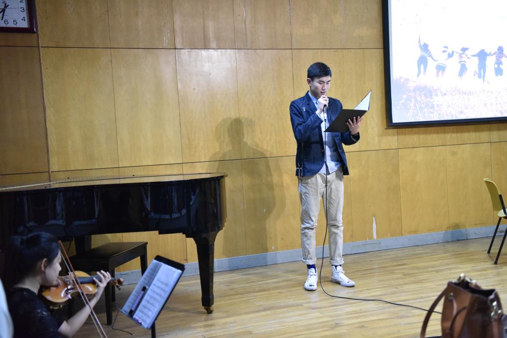 2014级学生孙延文和范梦瑶在即将面临毕业之际,分享了她们大学四年来发生的趣事和对学弟学妹们的寄语。孙延文同学第一次敞开心扉向大家分享了他青春里的小秘密,让人潸然泪下。最后两人用低沉浑厚、温和动人的声音朗读了题为《活在阳光下》的散文,带来了希望每个人能突破成长,越过困难,最终活在阳光下的美好祝愿。