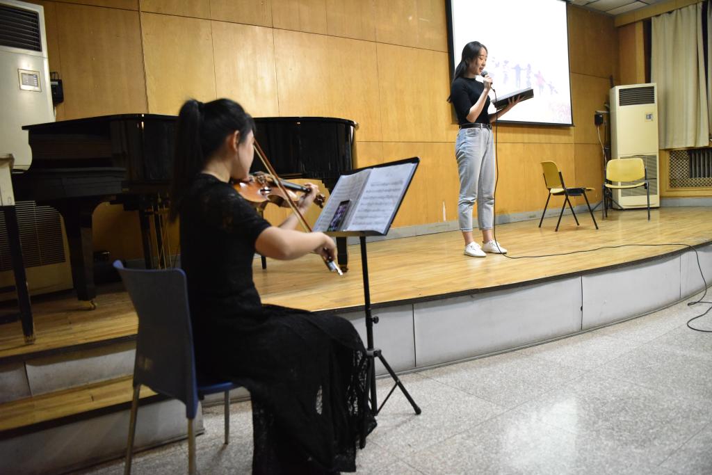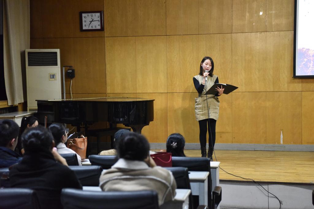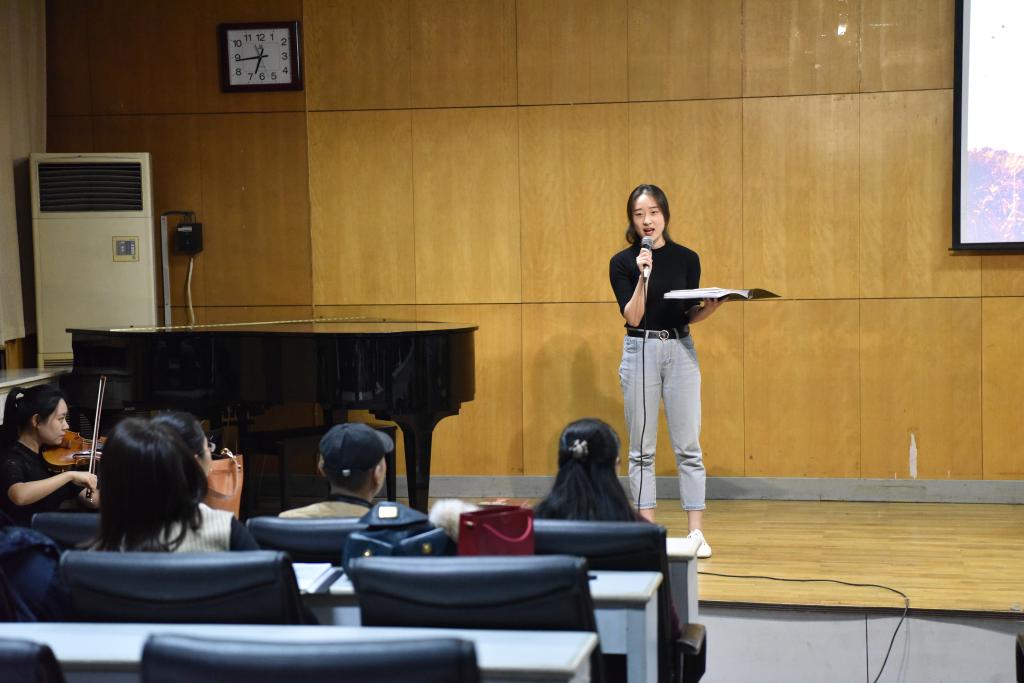 “当我爬上那一座座诱惑着我的山顶,但我又一次次鼓起信心向前走去,因为我听到海依然在远方为我喧腾……”2016级代琳同学以温柔、甜美的声音将诗词《在山的那边》与大家分享,这段来自她心灵的声音,深情动人。让大家感受到了她学习舞蹈十年的艰辛与辛苦,和不畏挫折、勇往直前的坚定意念。