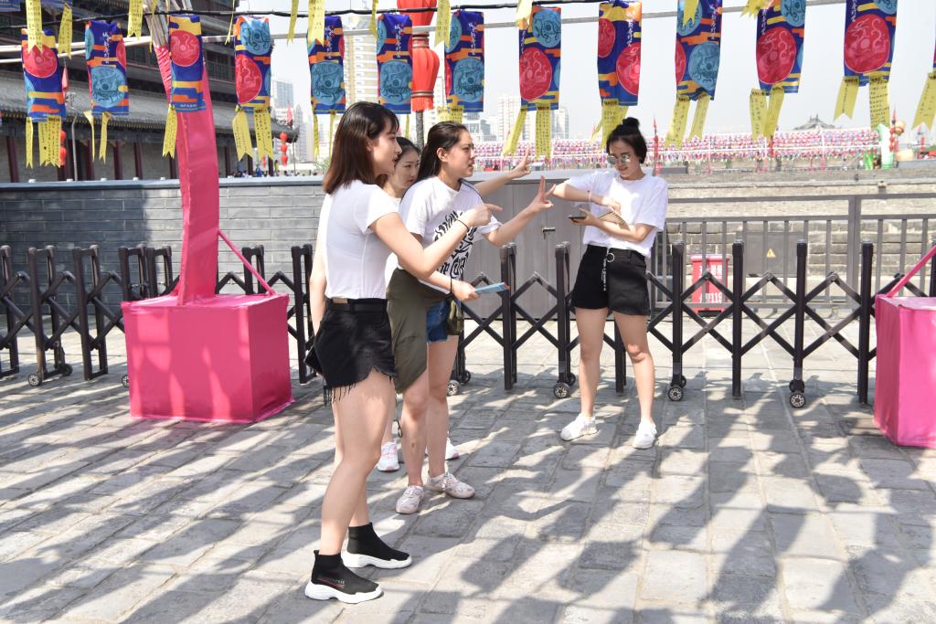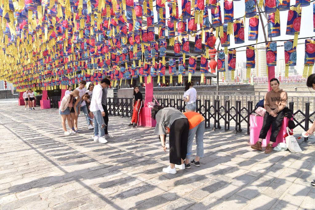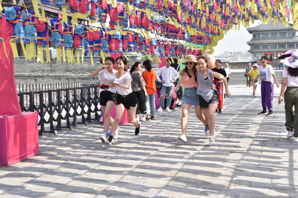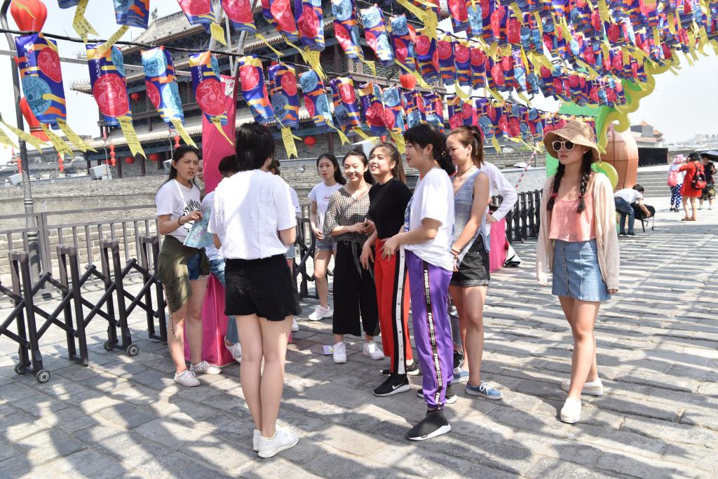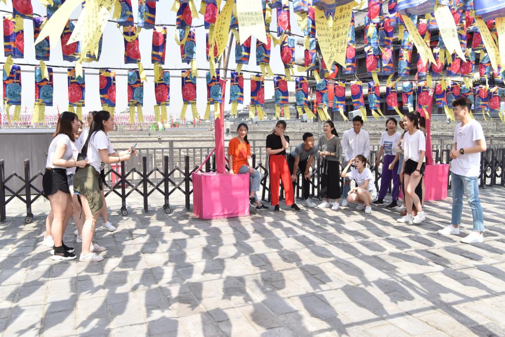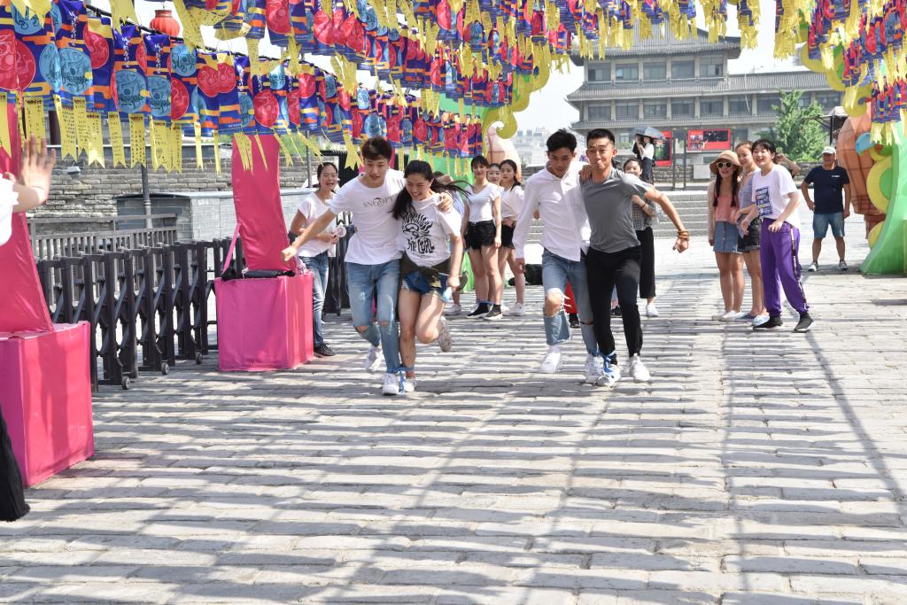 其次进行城墙知识趣味竞赛。将历史小知识容纳进如“三人两腿”、“你划我答”等简单的游戏中,不仅进一步加深了同学们对西安城墙文化的印象,更加强了集体的活力和凝聚力,增加了游览体验和乐趣。