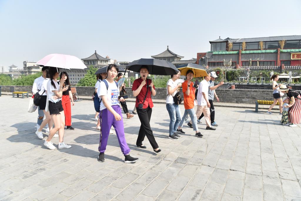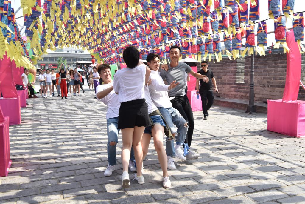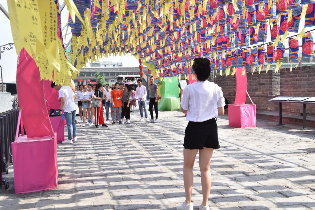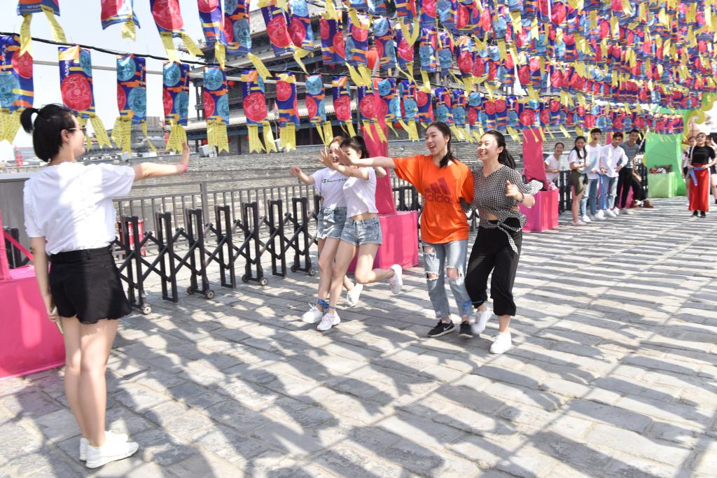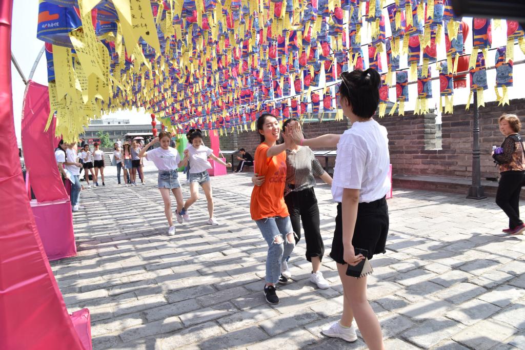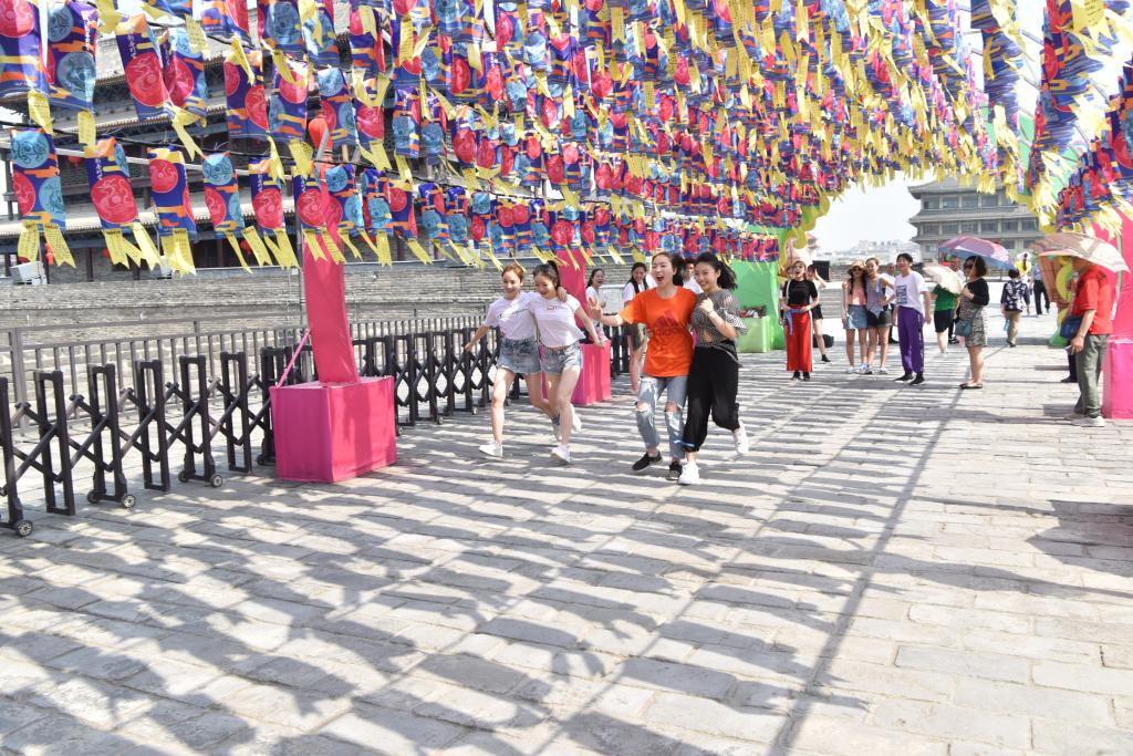 其次进行城墙知识趣味竞赛。将历史小知识容纳进如“三人两腿”、“你划我答”等简单的游戏中,不仅进一步加深了同学们对西安城墙文化的印象,更加强了集体的活力和凝聚力,增加了游览体验和乐趣。