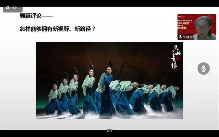 舞蹈评论写什么?如何获得新视角以及如何开辟新路径?张延杰老师主要针对这几个问题向我们进行了清楚详细的讲解。首先,张老师以中英双语结合的讲授方式向我们阐释了 “观后感(review)”和“评论(criticism)”二者的区别,让我对舞蹈评论写作的基本要求有了进一步的认识。其次,张老师向我们传授了获得新视角、开辟新路径的方法,从中我也更明确了自己可以努力的方向。最后,张老师提到了新媒体时代下舞蹈评论需要注意的问题,并给出了解决办法。在这场讲座中,张老师多次强调要学会提问,用批判性思维看待事物,培养“问题意识”。要开拓视野、多看多听,通古今、贯中外,与国际接轨,不断地接收各方的信息和知识。此次讲座干货满满,对我实有进益,非常感谢张延杰老师百忙中抽空为我们带来精彩的分享!