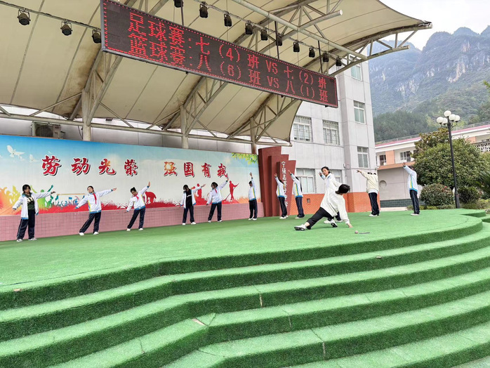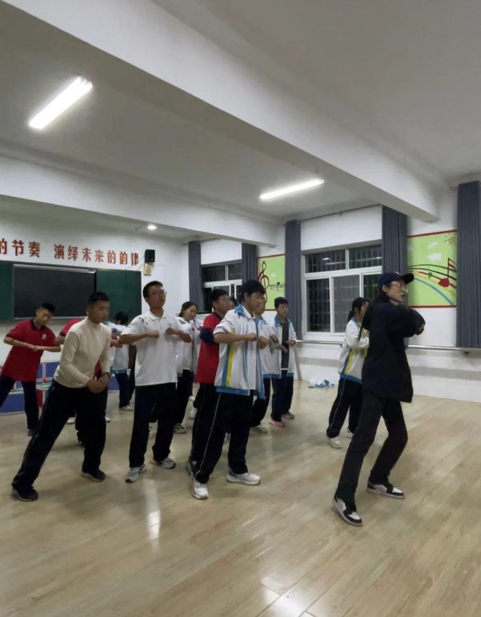 此次实习实践活动共教授两个群舞,分别是女子古典舞《橘颂》和街舞《无感》。由于该校大部分学生都是零基础,因此,从最初的选人到中期的排练,再到后期的合成演出,整个过程十分艰辛。三位舞学院的同学在学校的课间活动期间去往每一个班级亲自挑选人,并且鼓励同学们积极参与。虽然排练环境十分艰苦,仅有的一个教室无法满足两个作品同时排练的需求,但是,同学们不惧困难,克服坚硬的地板和突变的天气,坚持在操场完成排练。中学的学生学习十分辛苦,排练的时间安排在午餐后、晚餐后以及第三节晚自习,虽然时间紧张,但同学们都十分积极。由于昼夜温差,舞蹈学院的两位同学在晚自习排练结束后都出现了不同程度的病症,但是她们看到学生们一张张笑脸,仍然坚持带病排练。艰辛的过程造就完美的结果,展演后,两个群舞受到了学校领导和老师的一致好评!