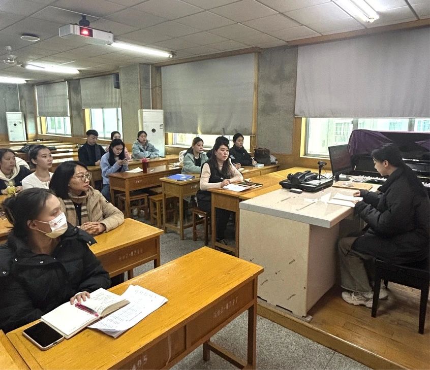 首先,12 位发展对象依次对自己近一年来的表现进行了自述和总结。他们分享了自己对党的认识、入党动机和现实表现,同时也反思了自身存在的不足之处,并表达了加入中国共产党的坚定决心;其次,由两位入党介绍人韩佳璇和高艺铭为 12 名发展对象作评议。他们根据对发展对象的了解,对其在思想政治、道德品质、学习工作等方面的表现进行了综合评价,并表示愿意介绍他们加入中国共产党;接下来,由教师代表和学生党员对 12 名发展对象进行了投票表决,一致同意他们成为预备党员。同时,老师们在会上对预备党员们寄予了重托,希望他们在各方面严格要求自己,保持良好的作风,不断强本领、求进步;最后,由教工党员代表为预备党员们佩戴党徽,进行入党誓词宣誓,并齐唱西安音乐学院陈大明教授作曲的歌曲《入党誓词》。在庄严的氛围中,预备党员们表达了对党的忠诚和为共产主义事业奋斗终身的坚定信念。