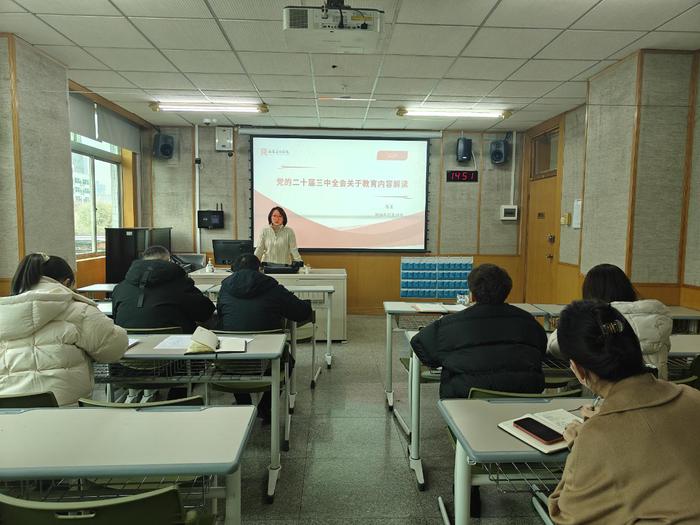分党委副书记、院长马昱以《党的二十届三中全会关于教育内容解读》为题,紧扣《中共中央关于进一步全面深化改革、推进中国式现代化的决定》中教育相关内容,强调要在强化思政育人、推进五育并举、培养拔尖人才、建设教师队伍、推进教育开放等方面加大探索创新力度,提升协同育人实效。