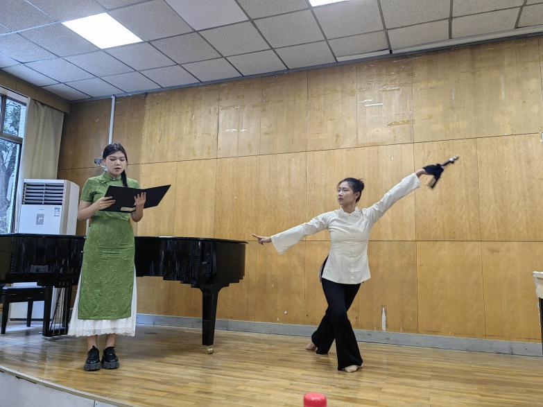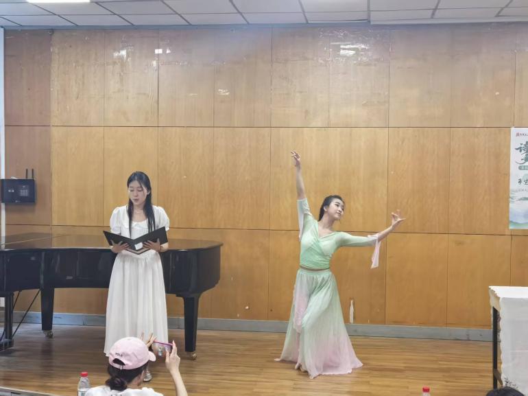 活动现场,同学们将朗诵与舞蹈表演相结合,生动诠释了沈善宝诗词的意境与情感。在《渡黄河》的激昂朗诵中,舞者以刚劲有力的动作展现黄河的壮阔与诗人的豪情;在《踏莎行·题蛱蝶图》的演绎中,轻盈灵动的舞姿则巧妙呼应了诗词中蝶舞花间的唯美画面灵动与诗意画卷的唯美;在《浪淘沙·平湖秋月》悠扬舒缓的朗诵下,舞者舞姿舒展流畅、圆润柔和;伴着《虞美人·送春》略带感伤的吟咏,舞者将春归无觅的惆怅、时光易逝的感怀娓娓道来;《满江红·渡扬子江有感》朗诵雄浑深沉,舞者以稳健厚重、富有张力的步伐与姿态传达深厚的家国情怀。