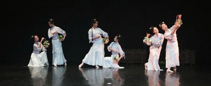 舞剧《诗意·诗经》以《诗经》中“赋、比、兴”手法与舞蹈编创思维的相关性入手,借鉴“赋比兴”文学创作的手法、情感性、思想性以及审美特征进行分析,从《诗经》中研究文学创作形象并寻找舞蹈创作题材,结合诗词与舞蹈的共通性,在尊重诗中文本的内涵基础上,加入编导个人的理解与思考,用舞蹈思维进行舞蹈化的解读与重构,以“赋”为情感的起点,由此再发展到“比”借形喻意,最后进入“兴”营造的意境。