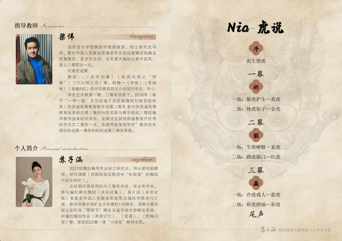 陕西凤翔彩绘泥塑,又称“泥货”、“泥活儿”始于先秦西周时期,流传民间 3000 年之久,是我国至今保留最古老最具民族特色的泥塑类手工制品。而其所有泥塑作品中,尤以泥塑虎最具代表性。因此,本晚会以泥塑虎为主要形象,而晚会名称中的“Nia”,则取自凤翔当地方言中的语气词。 本晚会提取泥塑虎绘色中的典型色彩并结合陕西人生冷蹭倔的性格,通过舞蹈呈现出六只不同色、形、性的泥塑虎,舞虎之形表其意之彩。