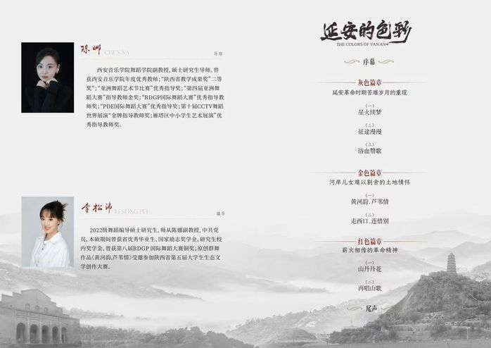 《延安的色彩》将作品分为三个篇章,也就是三个色块,分别是灰色、金色和红色。编导以当代人的视角贯穿其中,根据舞蹈特性和大众心理这两方面以“爱国形象”为契机,沿着“延安的三种色彩”进行塑造。反映出具有时代特色的“延安形象”和“延安精神”。灰色代表革命历史苦难岁月印记的重现,金色代表根植于黄土文化之上河岸儿女难以割舍的土地情怀,红色代表薪火相传的红色革命精神。