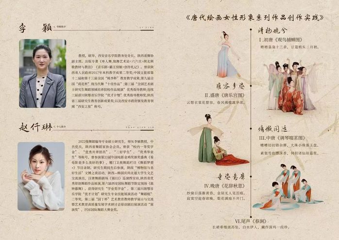 《唐代绘画女性形象系列作品创作实践》专场汇报是从唐代绘画中的女性形象出发,通过对前朝、胡风、蛮夷三个层面对唐代女性形象生成的影响进行分析;运用从图“像”到形“象”的编创方法对画作中的女性形象进行择取,编创;进而形成唐代不同时期女性所呈现出的风格样貌。